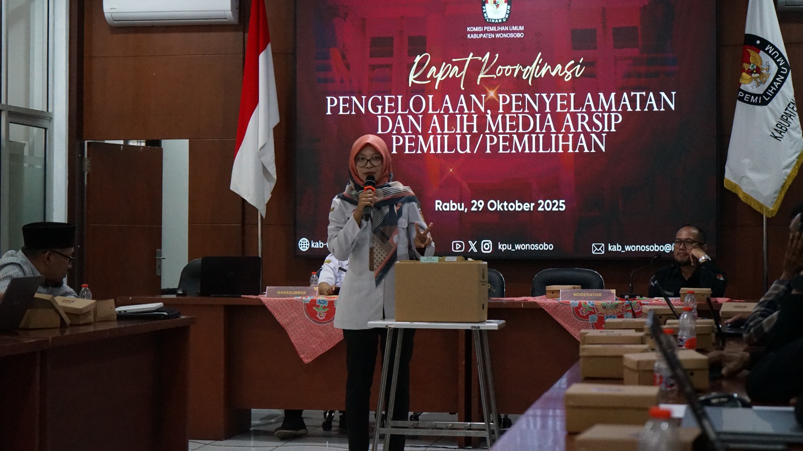 Wonosobo, 29 Oktober 2025 — Komisi Pemilihan Umum (KPU) Kabupaten Wonosobo menyelenggarakan Rapat Koordinasi Pengelolaan, Penyelamatan Arsip, dan Alih Media Arsip Pemilu/Pemilihan bertempat di Aula KPU Kabupaten Wonosobo. Kegiatan ini diikuti oleh semua anggota KPU, Sekretaris beserta jajaran Sekretariat KPU Kabupaten Wonosobo.