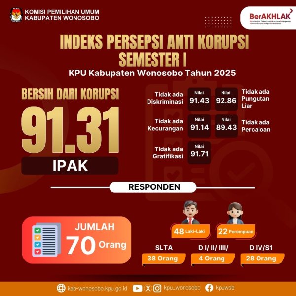KPU Kabupaten Wonosobo telah melaksanakan Survei Persepsi Anti Korupsi (SPAK) Semester I Tahun 2025 sebagai bagian dari upaya pembangunan Zona Integritas menuju Wilayah Bebas dari Korupsi (WBK) dan Wilayah Birokrasi Bersih dan Melayani (WBBM).