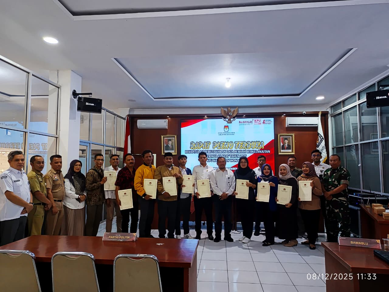 Wonosobo - KPU Kabupaten Wonosobo melaksanakan Rapat Pleno Terbuka Rekapitulasi Pemutakhiran Data Pemilih Berkelanjutan (PDPB) Triwulan IV Tahun 2025. Rapat pleno dilaksanakan pada hari Senin, 8 Desember 2025 di Aula Kantor KPU Kabupaten Wonosobo. Kegiatan rapat pleno diikuti oleh perwakilan dari Polres Wonosobo, Kodim 0707 Wonosobo, Badan Kesbangpol Wonosobo, Dinas Dukcapil Wonosobo, Dinas Sosial & PMD Wonosobo, Kementerian Agama Wonosobo, Bagian Pemerintahan Setda Wonosobo, Rutan II B Wonosobo, Bawaslu Wonosobo, dan perwakilan partai politik di Kabupaten Wonosobo beserta jajaran Komisioner dan Sekretariat KPU Kabupaten Wonosobo.