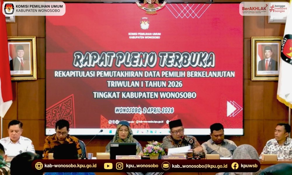 Pelaksanaan rapat pleno dipimpin oleh Ketua KPU Kabupaten Wonosobo, Bapak Ruliawan Nugroho. Selanjutnya adalah pembacaan tata tertib rapat pleno oleh anggota KPU Hukum dan Pengawasan, Bapak Kabul. Pembacaan rekapitulasi pemutakhiran data pemilih berkelanjutan dilakukan oleh anggota KPU divisi perencanaan, data dan informasi, Ibu Yusy Arafah. Rekapitulasi Daftar Pemilih Berkelanjutan Triwulan I Tahun 2026 tingkat Kabupaten Wonosobo berjumlah 722.823 pemilih. Terdiri dari 366.866 pemilih laki – laki dan 355.957 pemilih perempuan yang tersebar di 265 Desa / Kelurahan, dan 15 Kecamatan. Terdapat 3.641 pemilih baru 4.532 pemilih tidak memenuhi syarat dan 7.538 pemilih ubah.