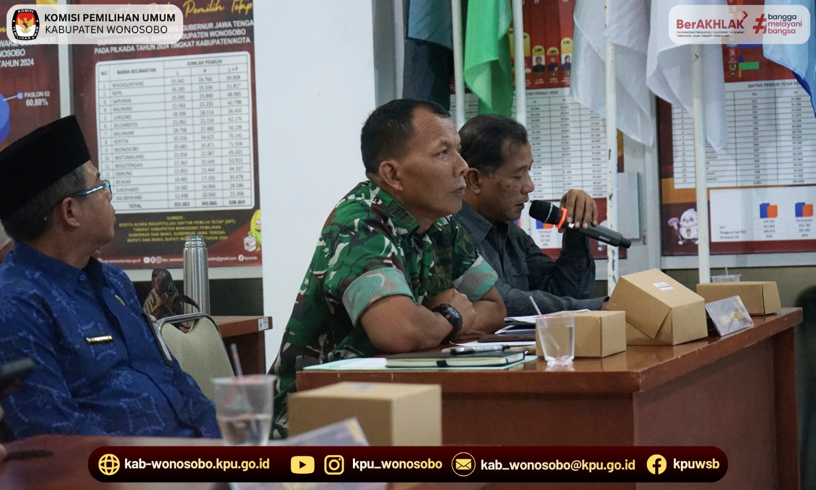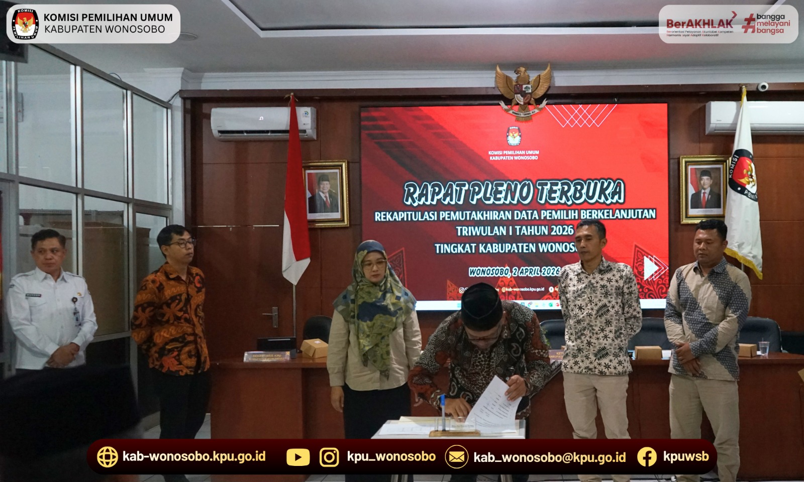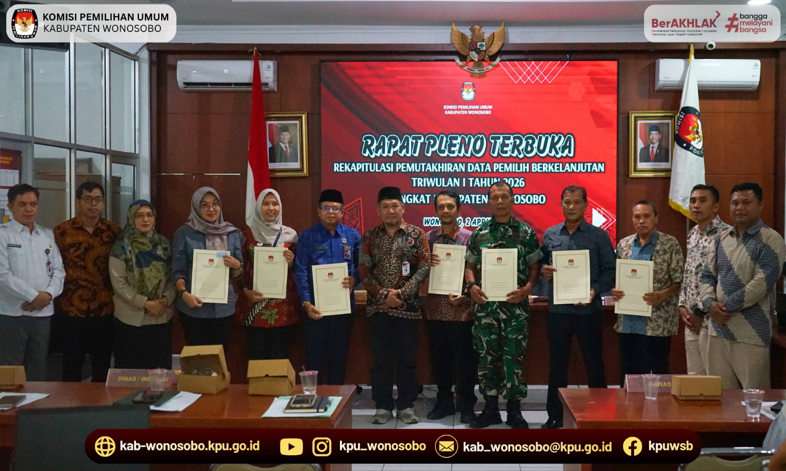 KPU Kabupaten Wonosobo melaksanakan Rapat Pleno Terbuka Rekapitulasi Pemutakhiran Data Pemilih Berkelanjutan (PDPB) Triwulan I Tahun 2026. Rapat pleno dilaksanakan pada hari Kamis, 2 April 2026 di Aula Kantor KPU Kabupaten Wonosobo. Kegiatan rapat pleno diikuti oleh perwakilan dari Polres Wonosobo, Kodim 0707 Wonosobo, Badan Kesbangpol Wonosobo, Dinas Dukcapil Wonosobo, Kementerian Agama Wonosobo, Bagian Pemerintahan Setda Wonosobo, Bawaslu Wonosobo, dan perwakilan partai politik di Kabupaten Wonosobo beserta jajaran Komisioner dan Sekretariat KPU Kabupaten Wonosobo.