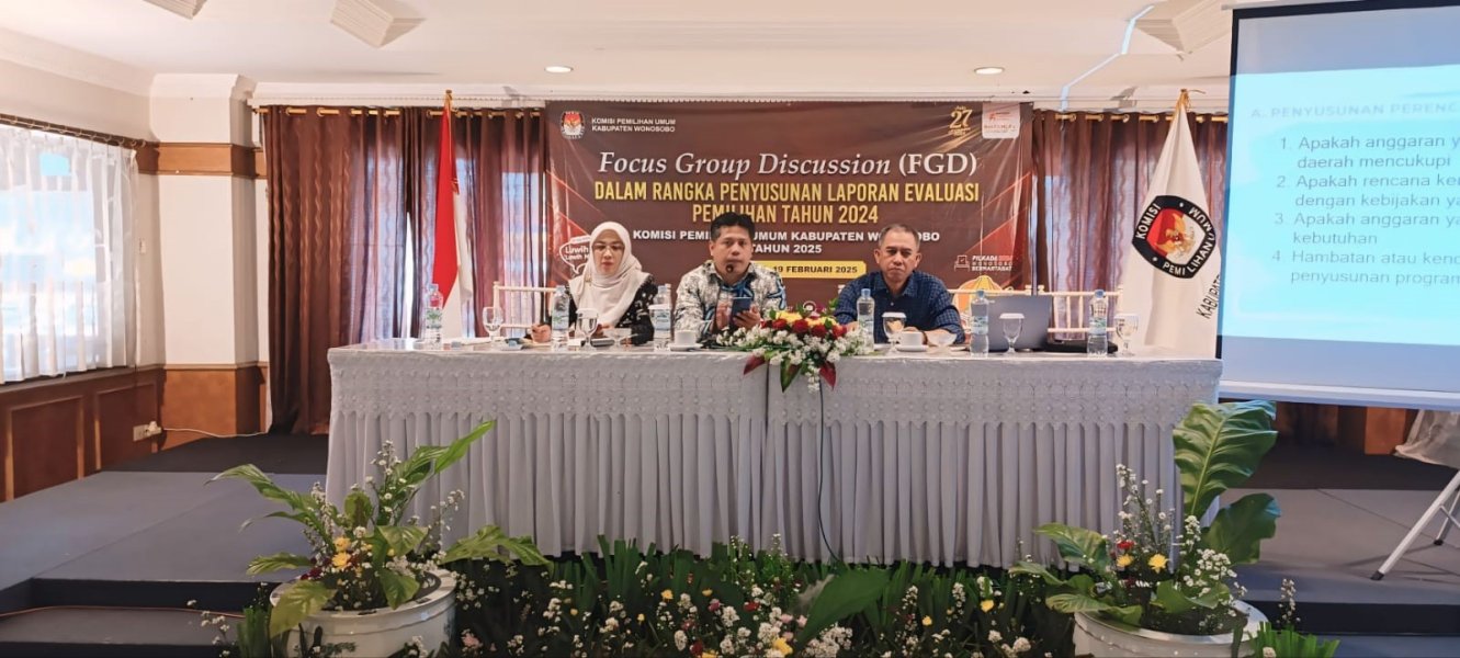 KPU Kabupaten Wonosobo melaksanakan Focus Group Discussion (FGD) dalam rangka Penyusunan Laporan Evaluasi Pemilihan Tahun 2024. Kegiatan ini dilaksanakan pada hari Rabu, 19 Februari 2025 di Hotel Surya Asia. Kegiatan FGD diikuti oleh jajaran Forkompimda Wonosobo, Perwakilan Bakesbangpol Wonosobo, Perwakilan Diskominfo Wonosobo, Perwakilan Bagian Pemerintahan Setda Wonosobo, Ketua Bawaslu Wonosobo, Pemantau Pemilu, LO Pasangan Calon Bupati dan Wakil Bupati Wonosobo, Wartawan media cetak dan elektronik di Wonosobo, perwakilan mantan anggota PPK Pilkada 2024 dan Komisioner serta seluruh jajaran Sekretariat KPU Kabupaten Wonosobo. Narasumber dalam acara ini yaitu Bapak Ikhwanudin selaku mantan anggota KPU Provinsi Jawa Tengah periode 2018 – 2023 dan Bapak Asma’ Khozin selaku mantan Ketua KPU Kabupaten Wonosobo periode 2018 – 2023.