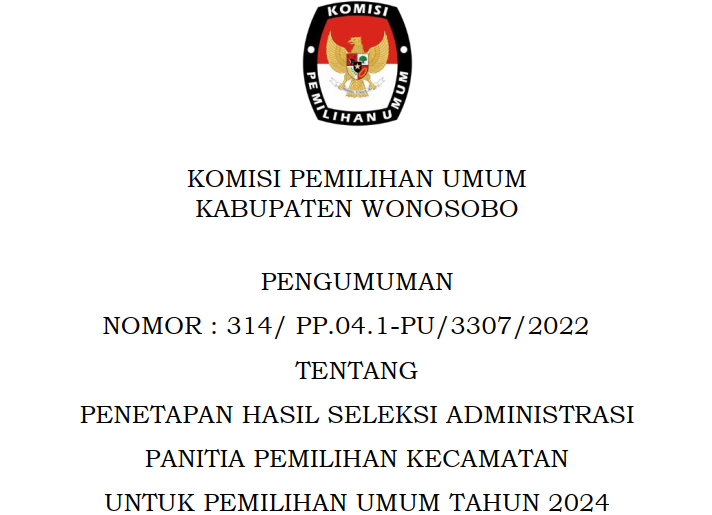 PENGUMUMAN NOMOR 314/ PP.04.1-PU/3307/2022 TENTANG PENETAPAN HASIL SELEKSI ADMINISTRASI PANITIA PEMILIHAN KECAMATAN UNTUK PEMILIHAN UMUM TAHUN 2024