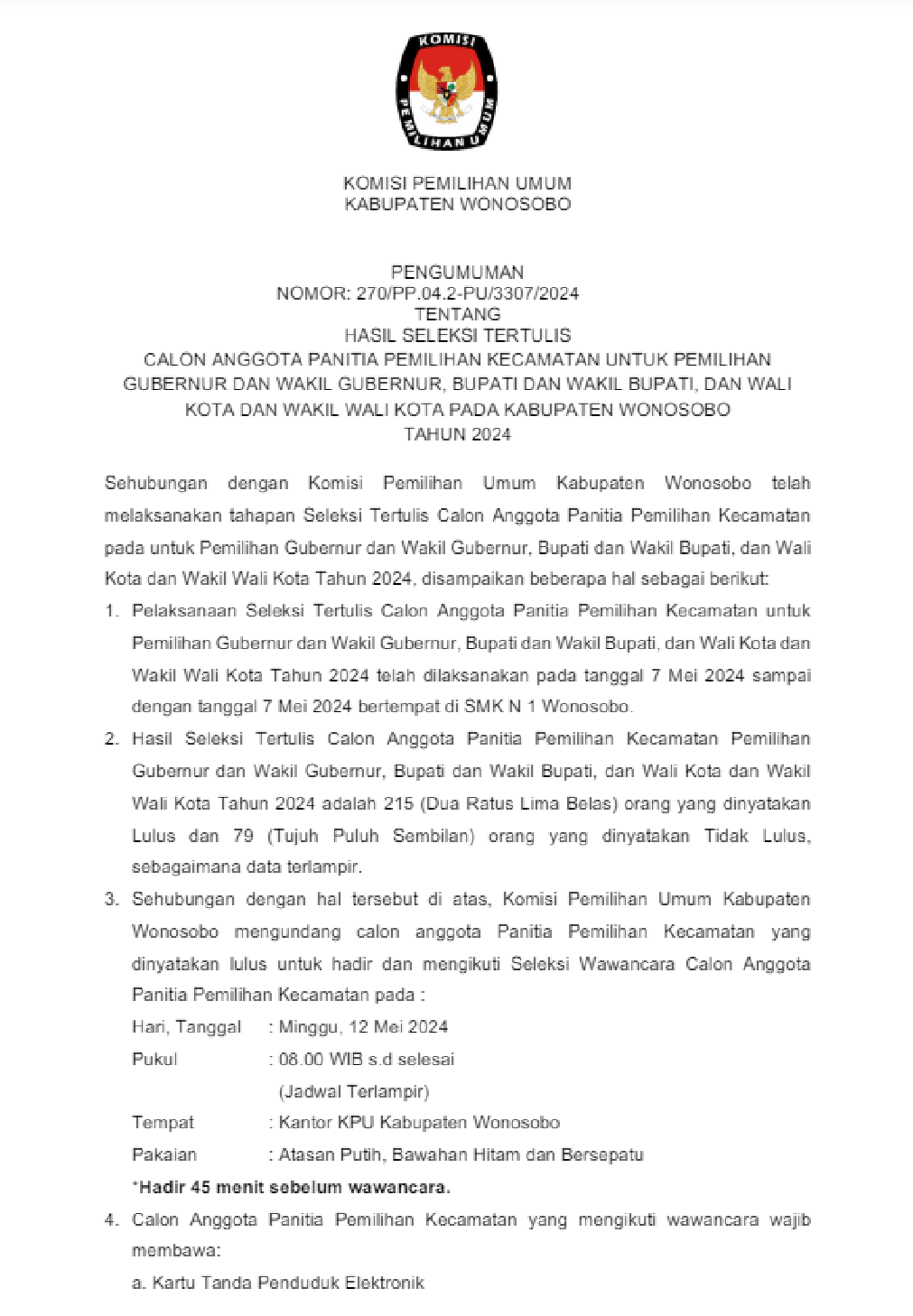 HASIL SELEKSI TERTULIS CALON ANGGOTA PANITIA PEMILIHAN KECAMATAN UNTUK PEMILIHAN GUBERNUR DAN WAKIL GUBERNUR, BUPATI DAN WAKIL BUPATI, DAN WALI KOTA DAN WAKIL WALI KOTA PADA KABUPATEN WONOSOBO TAHUN 2024