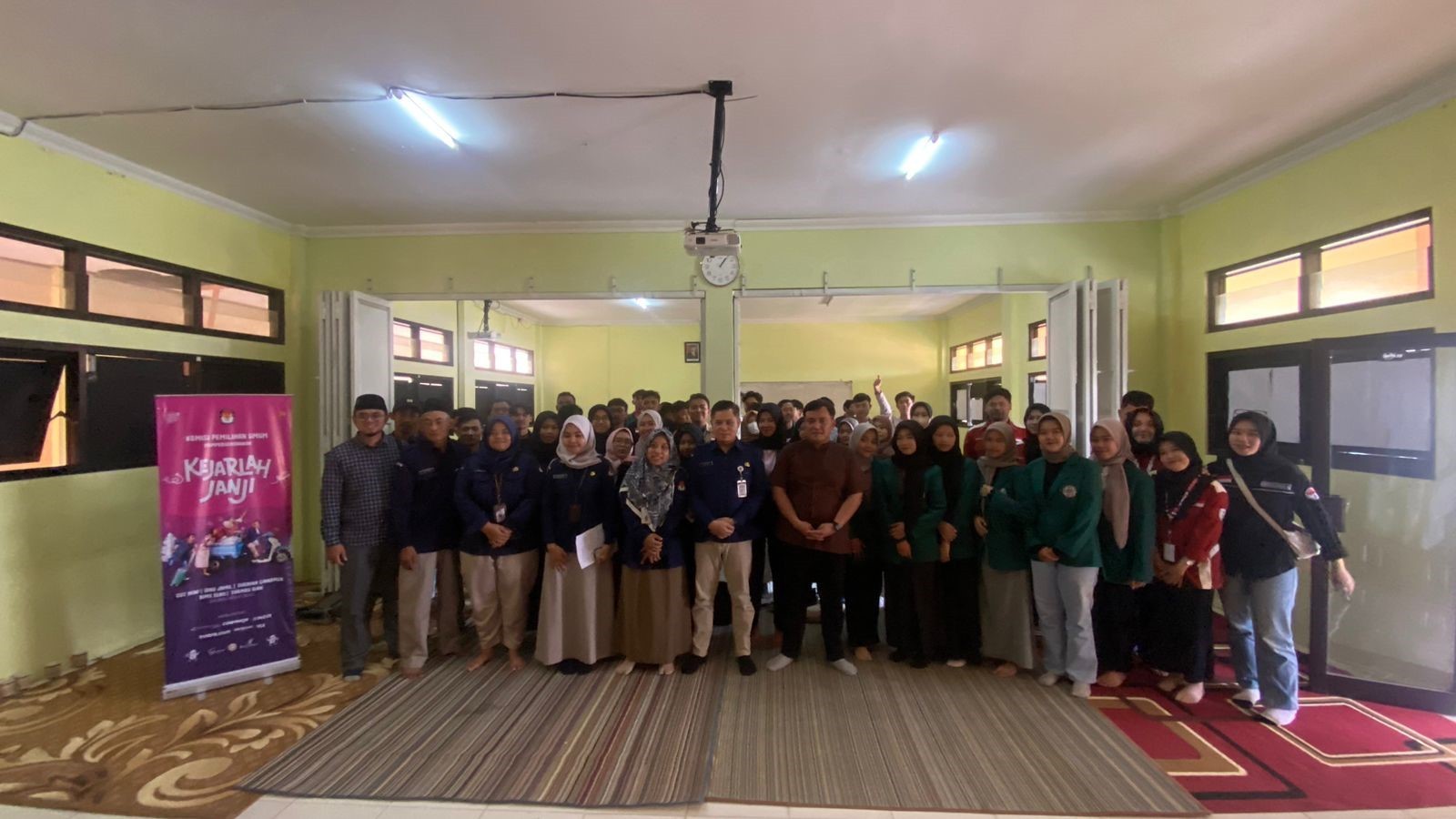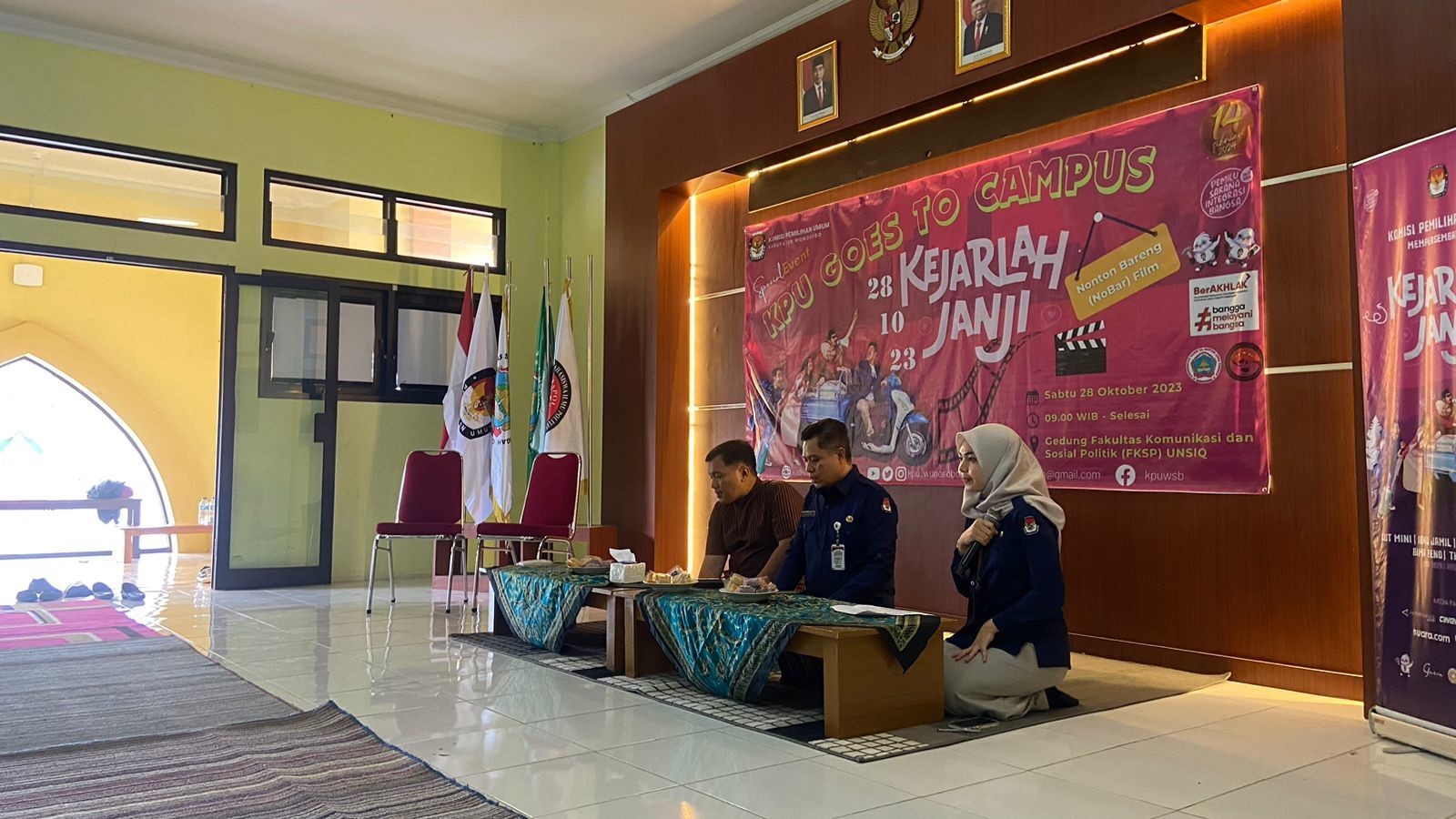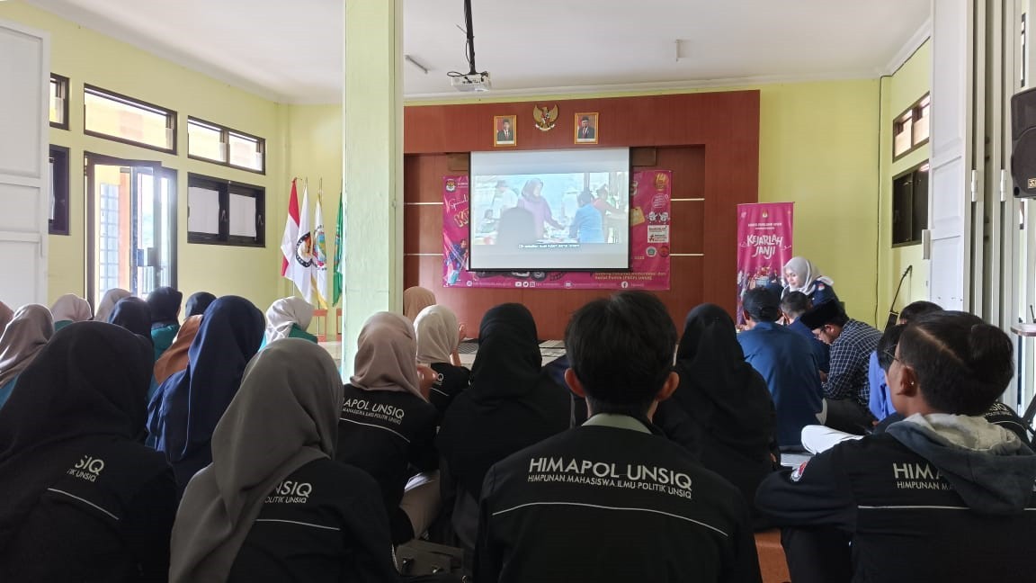 KPU Goes To Campus Pada Hari Sumpah Pemuda Nonton Bareng Film “Kejarlah Janji”. Kegiatan KPU Goes to Campus dilaksanakan pada tanggal 28 Oktober 2023 bertepatan dengan Hari Sumpah Pemuda pada pukul 09.00 s.d selesai bertempat di Universitas Sains Al-Qur’an (UNSIQ), Kalibeber, Wonosobo. Sosialisasi KPU Goes To Campus dilaksanakan dengan mengadakan kegiatan nonton bersama secara offline film “Kejarlah Janji” yang disutradarai dan dibintangi oleh sutradara dan bintang film kenamaan tanah air serta pemberian materi kepemiluan.