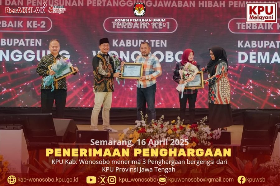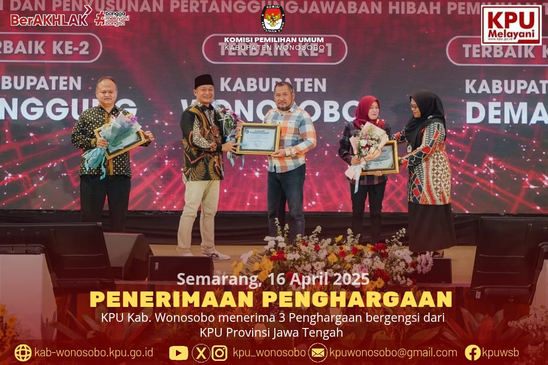 Semarang, Komisi Pemilihan Umum (KPU) Kabupaten Wonosobo mendapatkan tiga penghargaan sekaligus dalam kegiatan Evaluasi Tahapan Pemilihan Gubernur, Bupati, dan Walikota Tahun 2024 yang diselenggarakan oleh KPU Provinsi Jawa Tengah pada 15–17 April 2025 di Hotel Griya Persada, Kabupaten Semarang.