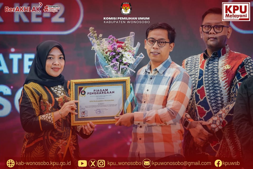 Penghargaan tersebut diterima langsung oleh Ketua KPU Wonosobo, Ruliawan Nugroho, dan Ketua Divisi Teknis Penyelenggaraan Pemilu, Robingul Ahsan, mewakili seluruh jajaran KPU Wonosobo yang telah bekerja keras selama proses Pilkada Serentak 2024.