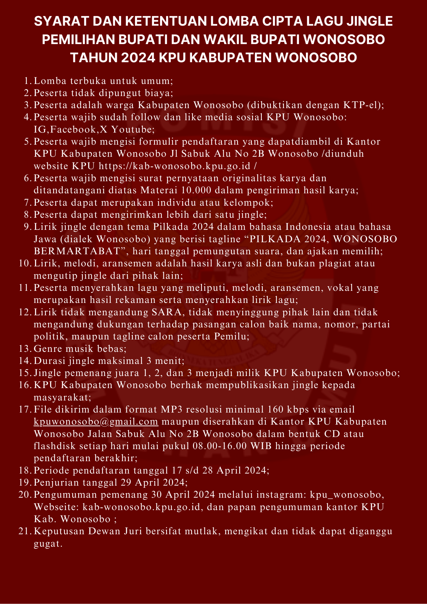 LOMBA CIPTA LAGU JINGLE PEMILIHAN BUPATI DAN WAKIL BUPATI WONOSOBO TAHUN 2024 KPU KABUPATEN WONOSOBO