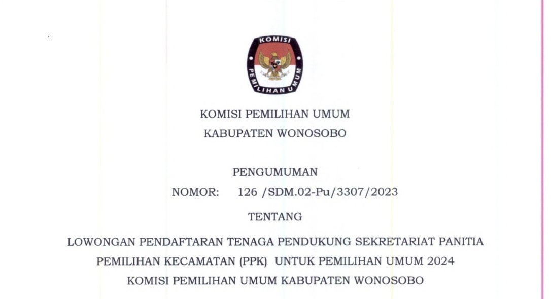 LOWONGAN PENDAFTARAN TENAGA PENDUKUNG SEKRETARIAT PANITIA PEMILIHAN KECAMATAN ( PPK ) UNTUK PEMILIHAN UMUM TAHUN 2024 KOMISI PEMILIHAN UMUM KABUPATEN WONOSOBO Kamis, 09 Maret 2023 16:03 1111 https://kab-wonosobo.kpu.go.id/public/kab-wonosobo/dmdocument/1678350791126-Pengumuman Tenaga Pendukung Sekretariat PPK_compressed.pdf Bagikan: Dilihat 1,111 Kali.