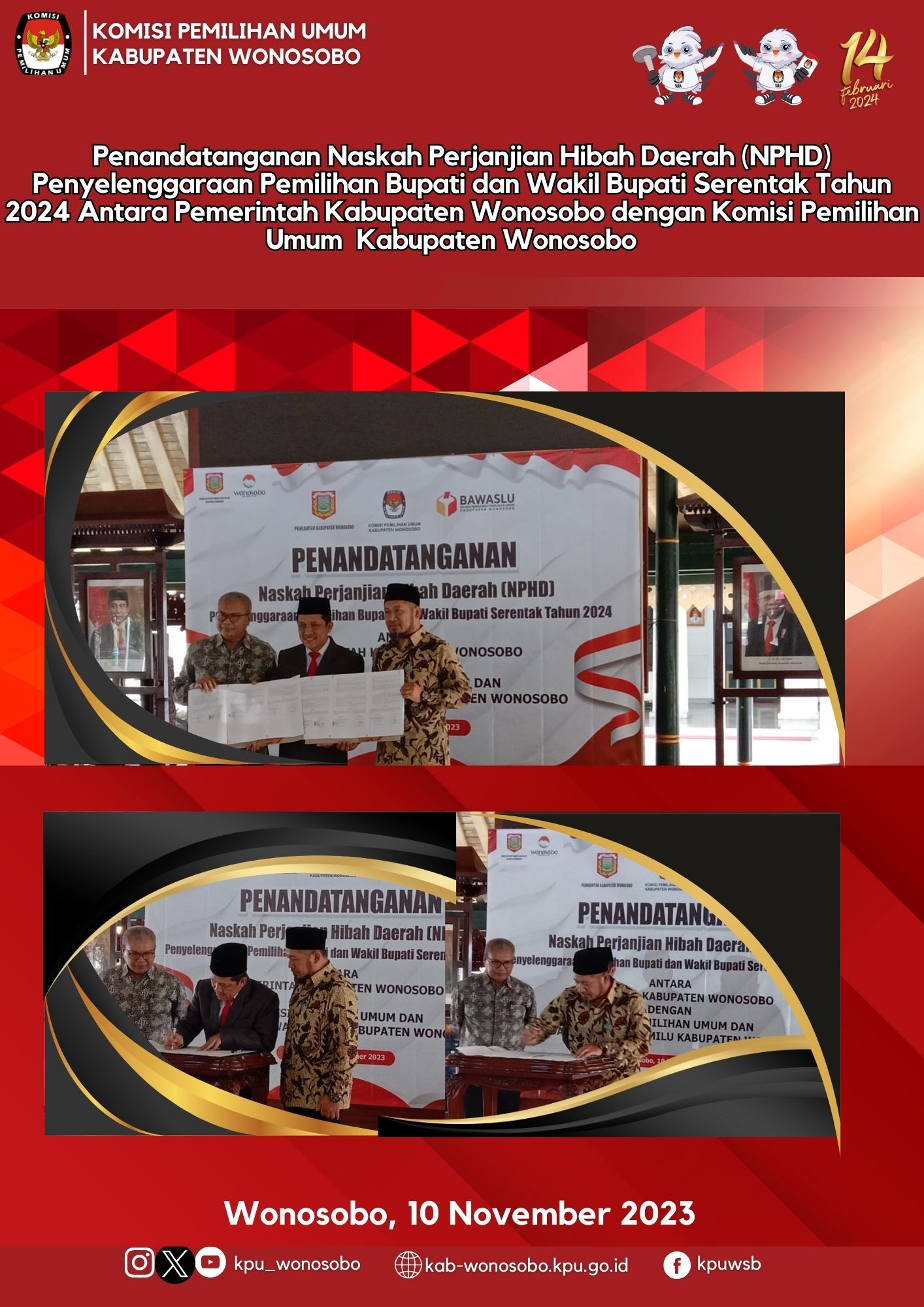 Komisi Pemilihan Umum Kabupaten Wonosobo dan Pemerintah Kabupaten Wonosobo melaksanakan penandatanganan naskah perjanjian hibah daerah (NPHD) untuk penyelenggaraan Pemilihan Bupati dan Wakil Bupati Serentak Tahun 2024. Penandatanganan dilakukan pada hari Jum'at, 10 November 2023 bertempat di Pendopo Kabupaten Wonosobo. Kegiatan penandatangan NPHD diikuti oleh Bupati Wonosobo, Forum Komunikasi Pimpinan Daerah (Forkompimda) Kabupaten Wonosobo, Tim Anggaran Pemerintah Daerah yang terdiri dari BAPPEDA, DPPKAD, Inspektorat, dan Bagian Hukum dan Bagian Pemerintahan Sekretariat Daerah Kabupaten Wonosobo. Badan Kesbangpol Kabupaten Wonosobo selaku koordinator antara KPU Kabupaten Wonosobo juga turut hadir dalam acara ini.