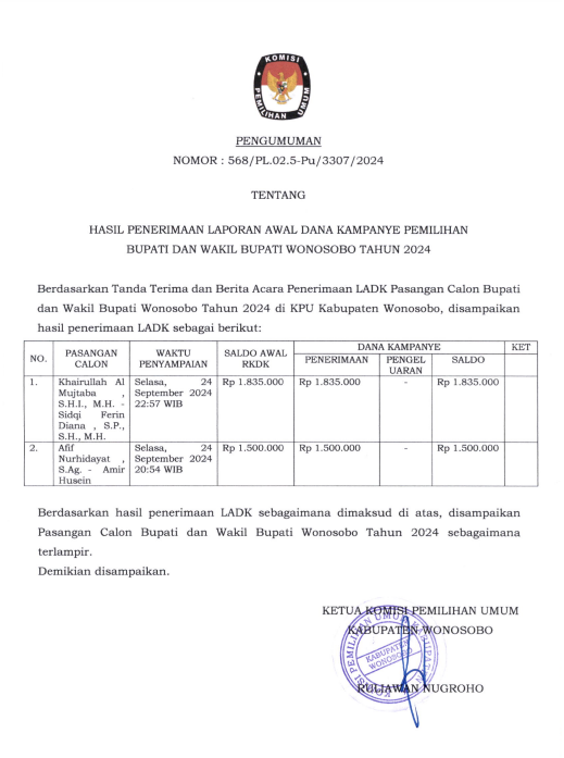 PENGUMUMAN PENERIMAAN LAPORAN AWAL DANA KAMPANYE PEMILIHAN BUPATI DAN WAKIL BUPATI WONOSOBO TAHUN 2024 ...... klik disini