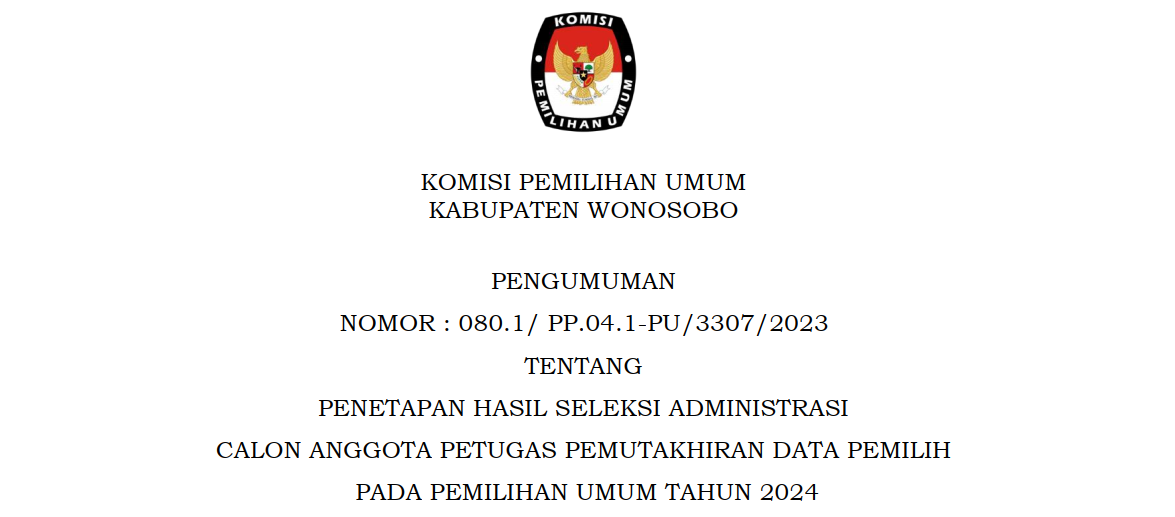 PENETAPAN HASIL SELEKSI ADMINISTRASI CALPANTARLIH Selasa, 07 Februari 2023 19:30 227 DOWNLOAD PENGUMUMAN LULUS ADMINISTRASI CALPANTARLIH PEMILU 2024 DISINI Bagikan: Dilihat 227 Kali.