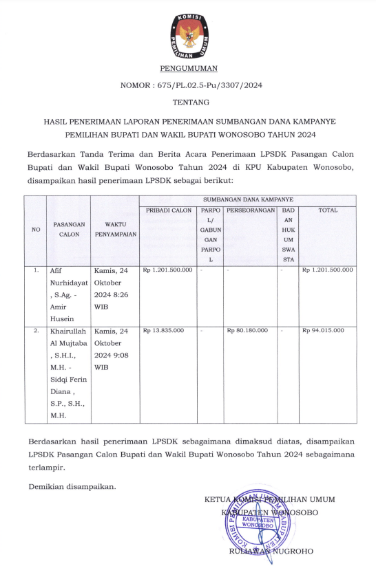 PENGUMUAN HASIL PENERIMAAN LAPORAN PENERIMAAN SUMBANGAN DANA KAMPANYE PEMILIHAN BUPATI DAN WAKIL BUPATI WONOSOBO TAHUN 2024 Sabtu, 26 Oktober 2024 09:15 1037 PENGUMUMAN LPSDK selangkapnya...... dapat diunduh disii Bagikan: Dilihat 1,037 Kali.