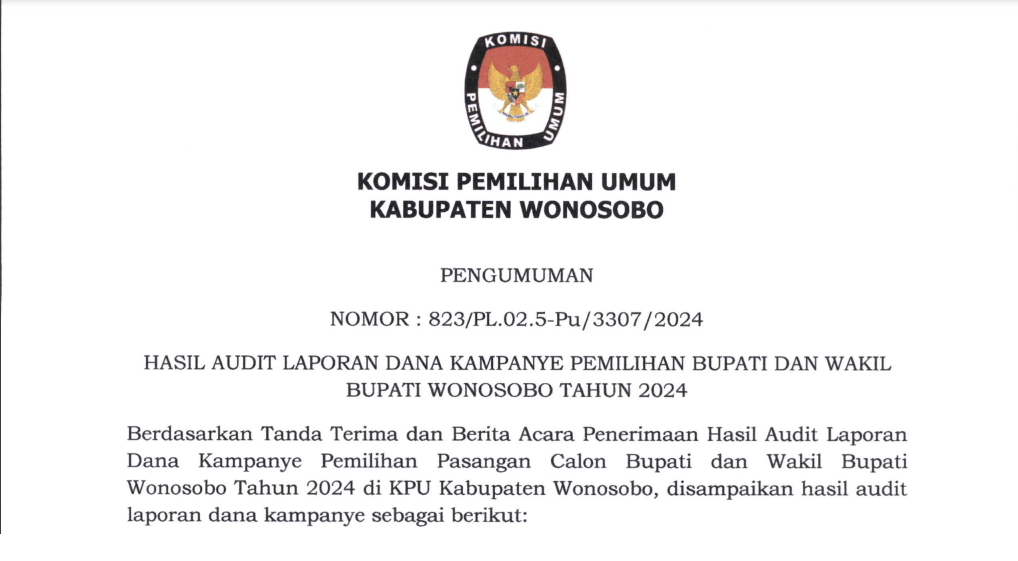 PENGUMUMAN HASIL AUDIT LAPORAN DANA KAMPANYE PEMILIHAN BUPATI DAN WAKIL BUPATI WONOSOBO TAHUN 2024 Kamis, 12 Desember 2024 09:09 1034 PENGUMUMAN HASIL AUDIT!!!!!...............disini Bagikan: Dilihat 1,034 Kali.