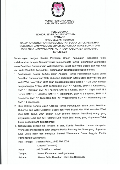 PENGUMUMAN HASIL TES TERTULIS SELEKSI PPS SE-KABUPATEN WONOSOBO PADA PEMILIHAN UMUM BUPATI DAN WAKIL BUPATI KABUPATEN WONOSOBO
