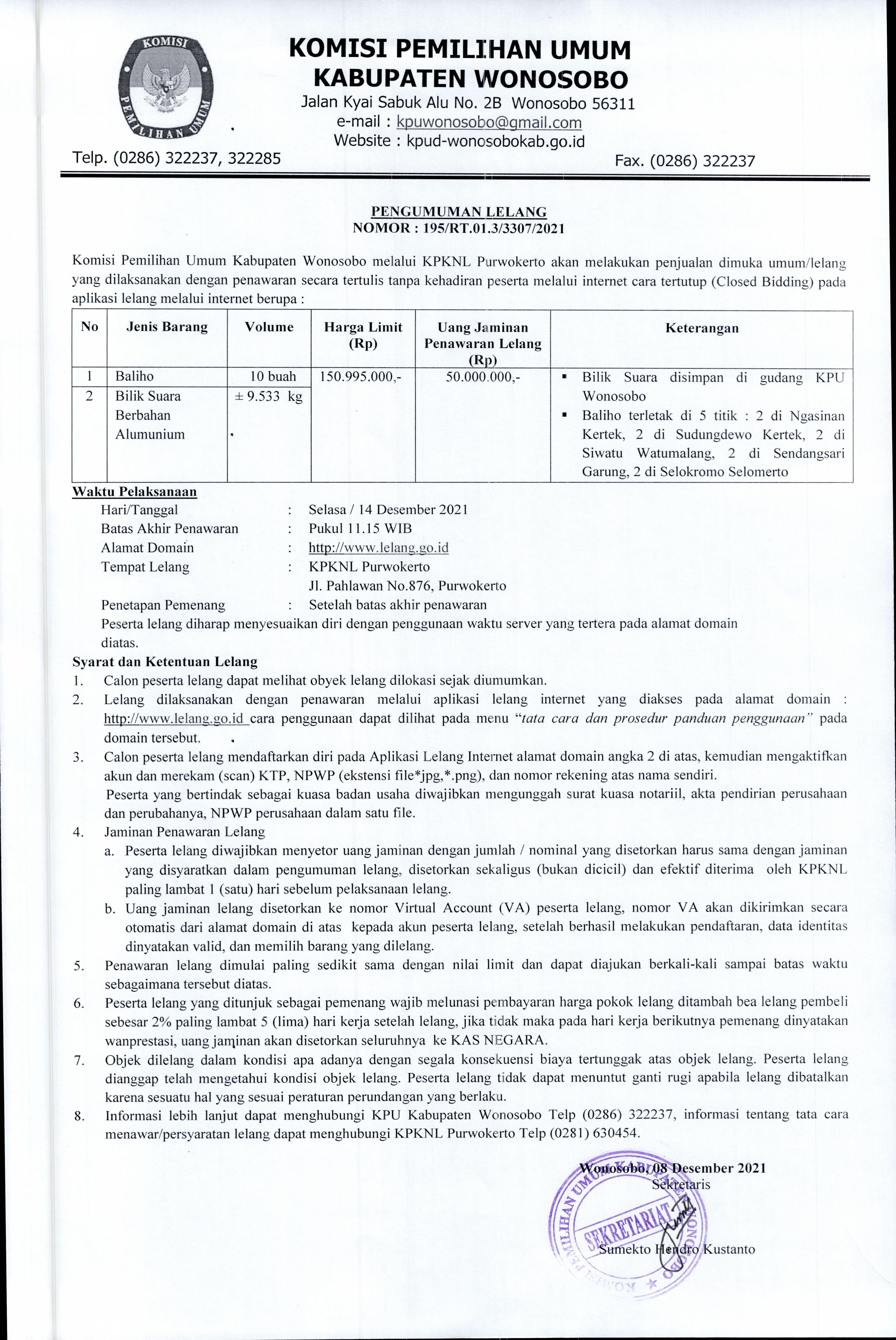 PENGUMUMAN LELANG BALIHO DAN BILIK SUARA BERBAHAN ALUMINIUM Rabu, 08 Desember 2021 00:00 742 Pengumuman dapat di unduh DISINI Bagikan: Dilihat 742 Kali.
