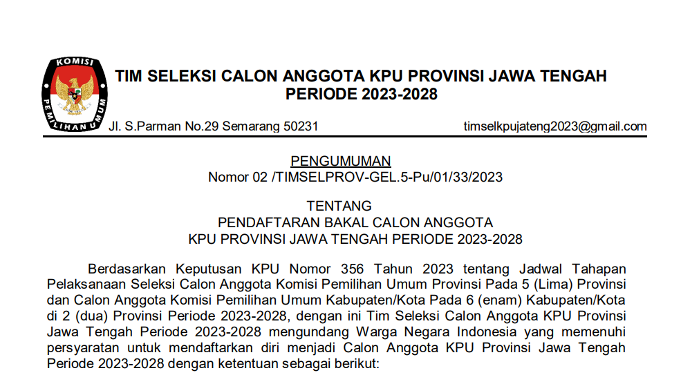 PENGUMUMAN NOMOR 02 /TIMSELPROV-GEL.5-Pu/01/33/2023 TENTANG PENDAFTARAN BAKAL CALON ANGGOTA KPU PROVINSI JAWA TENGAH PERIODE 2023-2028 Senin, 15 Mei 2023 09:00 223 DOWNLOAD PENGUMUMAN SELEKSI CALON ANGGOTA KPU JATENG 2023 Bagikan: Dilihat 223 Kali.