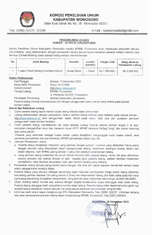 PENGUMUMAN NOMOR 321/RT.01.3-Pu/3307/2022 TENTANG LELANG SATU PAKET BARANG INVENTARIS KANTOR