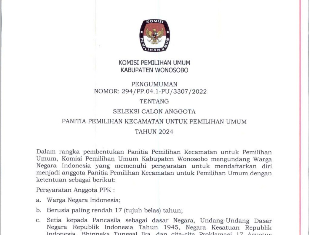 PENGUMUMAN PENDAFTARAN PPK PEMILU TAHUN 2024 Minggu, 20 November 2022 07:00 2592 Download Pengumuman Pendaftaran Bagikan: Dilihat 2,592 Kali.