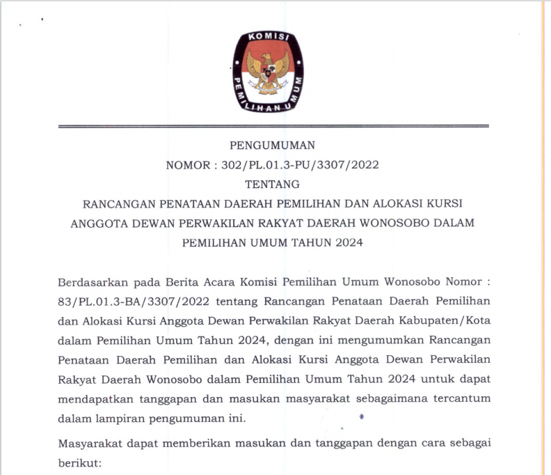 PENGUMUMAN RANCANGAN PENATAAN DAPIL DAN ALOKASI KURSI Rabu, 23 November 2022 14:11 532 Download Pengumuman dan Lampiran DISINI.pdf Bagikan: Dilihat 532 Kali.