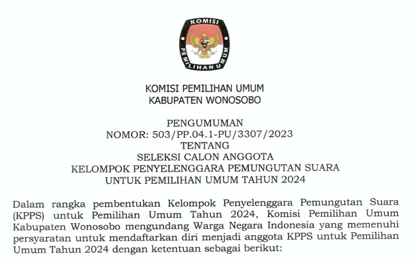 PENGUMUMAN SELEKSI CALON ANGGOTA KELOMPOK PENYELENGGARA PEMUNGUTAN SUARA UNTUK PEMILIHAN UMUM TAHUN 2024 Senin, 11 Desember 2023 08:00 253 DOWNLOAD PENGUMUMAN SELEKSI CALON ANGGOTA KPPS UNTUK PEMILU TAHUN 2024 Bagikan: Dilihat 253 Kali.