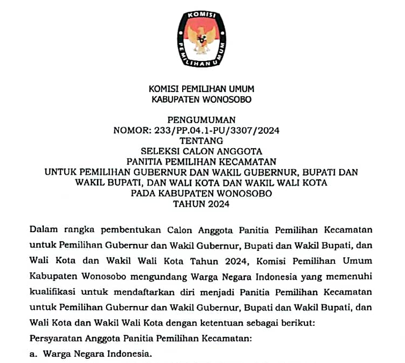 PENGUMUMAN SELEKSI CALON ANGGOTA PANITIA PEMILIHAN KECAMATAN UNTUK PILKADA TAHUN 2024 Selasa, 23 April 2024 06:00 165 DOWNLOAD PENGUMUMAN SELEKSI CALON ANGGOTA PPK UNTUK PILKADA 2024 Bagikan: Dilihat 165 Kali.