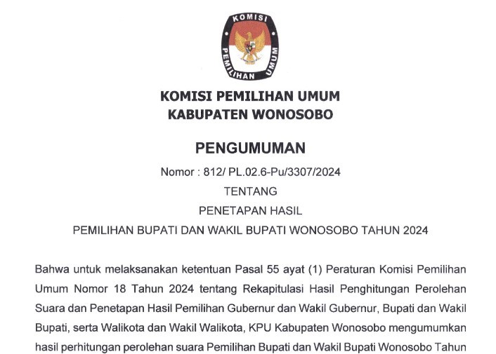 Pengumuman Tentang Penetapan Hasil Pemilihan Bupati dan Wakil Bupati Wonosobo Tahun 2024 Rabu, 04 Desember 2024 20:00 1090 Berikut Pengumuman Tentang Penetapan Hasil Pemilihan Bupati dan Wakil Bupati Wonosobo Tahun 2024 dapat diunduh disini. Salinan SK Penetapan Hasil Pilkada dapat diunduh disini. Bagikan: Dilihat 1,090 Kali.