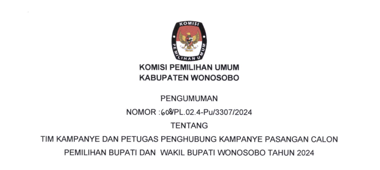 PENGUMUMAN TIM KAMPANYE DAN PETUGAS PENGHUBUNG KAMPANYE PASLON BUPATI DAN WAKIL BUPATI WONOSOBO TAHUN 2024