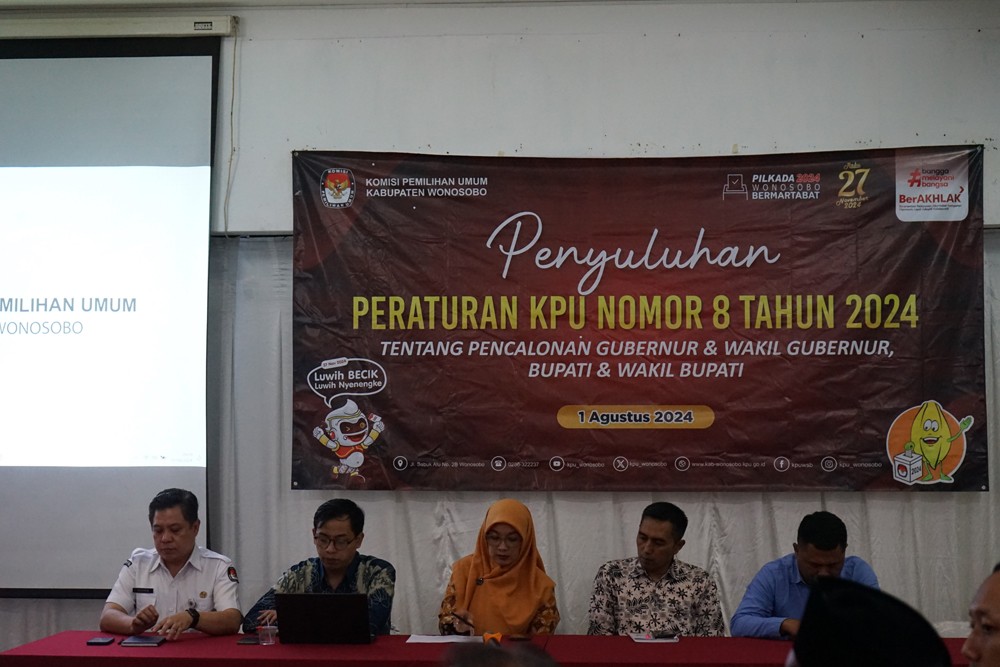 Pada 1 Agustus 2024, KPU Kabupaten Wonosobo melaksanakan acara penyuluhan Peraturan KPU Nomor 8 Tahun 2024 tentang Pencalonan Gubernur dan Wakil Gubernur, Bupati dan Wakil Bupati, Serta Walikota dan Wakil Walikota dilanjutkan dengan penyampaian regulasi dari PKPU 8 Tahun 2024 tentang Pencalonan Gubernur dan Wakil Gubernur, Bupati dan Wakil Bupati, Serta Walikota dan Wakil Walikota yang disampaikan oleh Robingul Ahsan selaku komisioner divisi teknis penyelenggara. Secara garis besar materi yang disampaikan adalah terkait dengan Alur Pendaftaran Calon Kepala Daerah dan Syarat Calon diantaranya adalah :