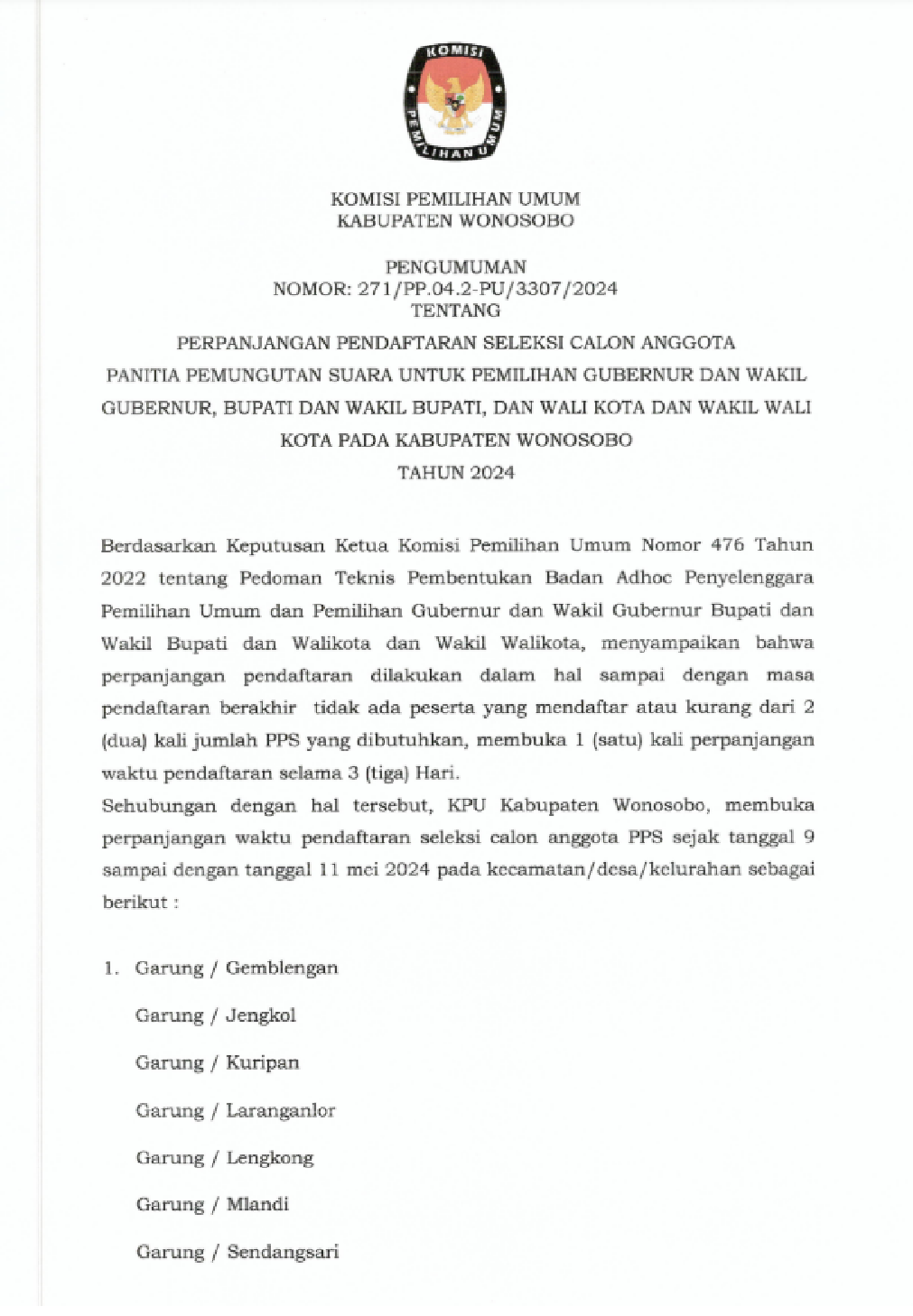 PENGUMUMAN PERPANJANGAN PENDAFTARAN SELEKSI CALON ANGGOTA PANITIA PEMUNGUTAN SUARA UNTUK PEMILIHAN GUBERNUR DAN WAKIL GUBERNUR, BUPATI DAN WAKIL BUPATI, DAN WALI KOTA DAN WAKIL WALI KOTA PADA KABUPATEN WONOSOBO TAHUN 2024