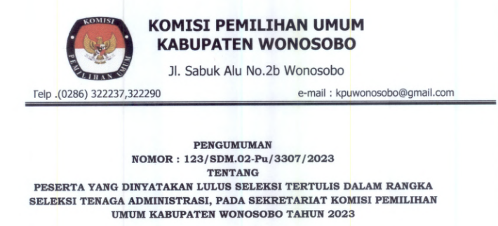 PESERTA YANG DINYATAKAN LULUS SELEKSI WAWANCARA TENAGA ADMINISTRASI PADA SEKRETARIAT KPU KABUPATEN WONOSOBO TAHUN 2023 Rabu, 08 Maret 2023 14:10 349 https://kab-wonosobo.kpu.go.id/public/kab-wonosobo/dmdocument/1678262972124-PENGUMUMAN LULUS SELEKSI WAWANCARA TENAGA ADMINISTRASI DI WONOSOBO (1) (1).pdf Bagikan: Dilihat 349 Kali.