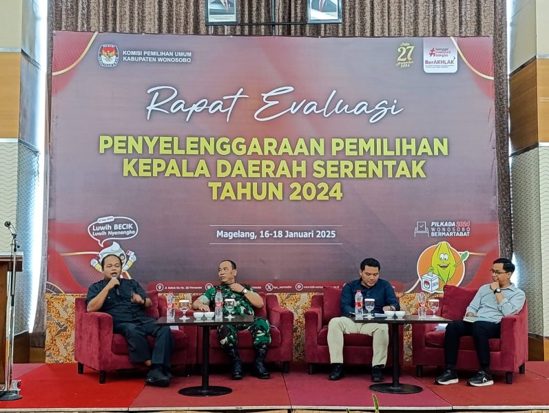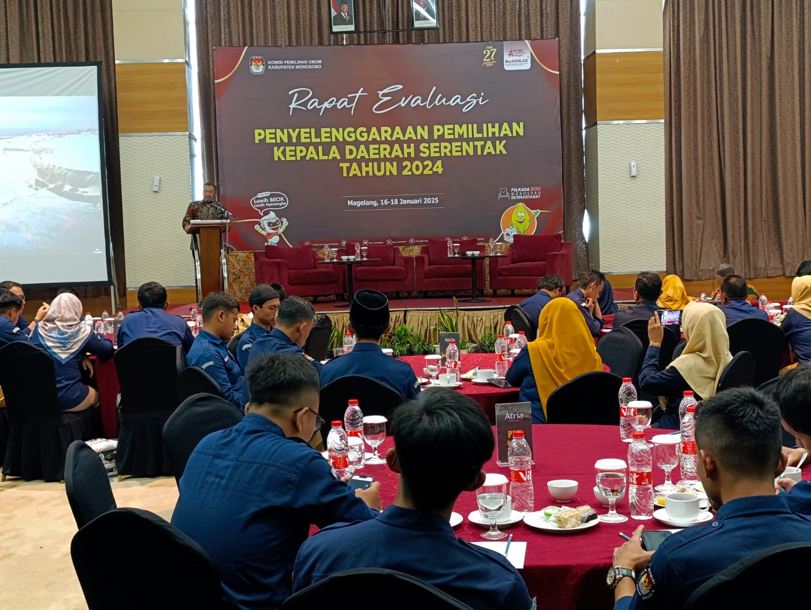 KPU Kabupaten Wonosobo melaksanakan kegiatan Rapat Evaluasi Penyelenggaraan Pemilihan Kepala Daerah Serentak Tahun 2024 di hotel Atria, Magelang pada tanggal 16 – 18 Januari 2025. Kegiatan rapat evaluasi diikuti oleh seluruh komisioner dan jajaran sekretariat di KPU Kabupaten Wonosobo, PPK dan Sekretariat PPK Se Kabupaten Wonosobo beserta instansi terkait. Instansi yang hadir dalam kegiatan rapat evaluasi yaitu Dinas Dukcapil Wonosobo, Badan Kesbangpol Wonosobo, dan Bagian Pemerintahan Setda Wonosobo. Kegiatan evaluasi di hari pertama yaitu peningkatan kapasitas yang diikuti oleh seluruh peserta yang hadir. Kegiatan ini dilaksanakan untuk meningkatkan soliditas dan tanggung jawab serta meningkatkan keakraban antar penyelenggara Pilkada. Kegiatan hari kedua berupa pemaparan materi oleh narasumber. Di sesi pertama disampaikan tiga materi oleh tiga narasumber yang dimoderatori oleh anggota KPU Divisi Teknis Penyelenggaraan, Bapak Robingul Ahsan. Materi pertama berjudul Evaluasi Penyelenggaraan Pemilihan Kepala Daerah Serentak Tahun 2024 yang disampaikan oleh Bapak AKP HM.Nurhasan,S.H.,M.H selaku Kasat Intelkam Polres Wonosobo. Materi kedua disampaikan oleh Kapten Arm Suyitno selaku Pasiops Kodim dengan materi berjudul Laporan Evaluasi Pilkada Serentak Kabupaten Wonosobo Tahun 2024. Materi ketiga yang berjudul Peran Kejaksaan dalam Pemilihan Kepala Daerah Serentak Tahun 2024 disampaiakan oleh Bapak Djoko Tri Atmodjo, SH selaku Kasi Intelijen Kejaksaan Negeri Wonosobo.