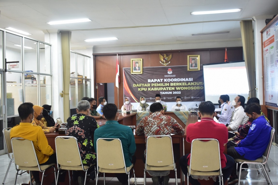 Rapat Koordinasi Penyusunan Daftar Pemilih Berkelanjutan yang dilaksanakan setiap tiga bulan sekali ini diikuti oleh Dinas/Instansi terkait seperti Bawaslu, Dispendukcapil, Kodim, Polrest, Kemenag, Lapas, KesBangpol, Dikpora serta Partai Politik Se Kabupaten Wonosobo. Dhyan Kartika Wulandari selaku Komisioner Devisi Perencanaan Data dan Informasi dalam paparannya menyebut, tujuan dari Kegiatan ini adalah dalam rangka Koordinasi untuk memperbaiki data pemilih berkelanjutan. Ia mendorong agar pihak pihak terkait saling bahu membahu untuk mewujudjan terciptanya daftar pemilih yang akurat dan valid. Di Kabupten Wonosobo saat ini berdasar hasil Pemutakhiran Data Pemilih Berkelanjutan sampai dengan Bulan Maret tahun 2022 tercatat sejumlah 680.015 ( enam ratus delapan puluh ribu llima belas ) pemilih dengan rincian laki-laki berjumlah 345.659 ( tiga ratus empat puluh lima ribu enam ratus lima puluh sembilan ) pemilih dan perempuan berjumlah 334.356 ( tiga ratus tiga puluh empat ribu tiga ratus lima puluh enam ) pemilih, yang tersebar di Lima belas kecamatan.
