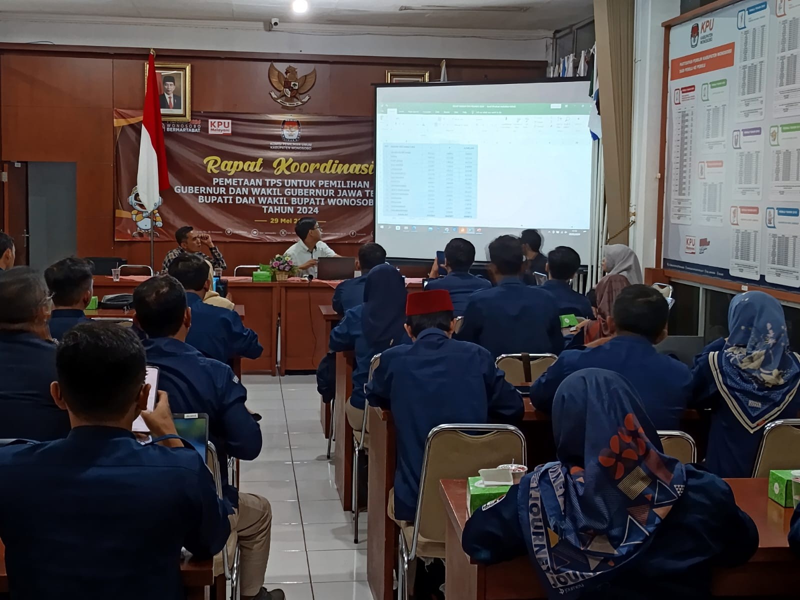 KPU Kabupaten Wonosobo melaksanakan Rapat Koordinasi Pemetaan TPS untuk Pemilihan Gubernur Dan Wakil Gubernur Jawa Tengah, Bupati Dan Wakil Bupati Wonosobo Tahun 2024. Rapat koordinasi ini merupakan rapat pertama pasca pelantikan PPS pada tanggal 26 Mei 2024. Rapat dilaksanakan pada hari Rabu, 29 Mei 2024 di kantor KPU Kabupaten Wonosobo. Rapat koordinasi diikuti oleh Ketua dan Anggota PPK divisi data dan informasi Se – Kabupaten Wonosobo. Turut hadir perwakilan dari Dinas Dukcapil Kabupaten Wonosobo dan Bawaslu Kabupaten Wonosobo.