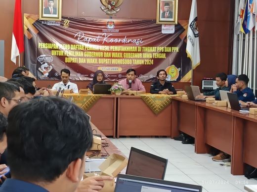 KPU Kabupaten Wonosobo melaksanakan Rapat Koordinasi Persiapan Pleno Daftar Pemilih Hasil Pemutakhiran (DPHP) di tingkat PPS dan PPK untuk Pemilihan Gubernur dan Wakil Gubernur Jawa Tengah, Bupati dan Wakil Bupati Kabupaten Wonosobo Tahun 2024 pada hari Rabu, 31 Juli 2024 di Kantor KPU Kabupaten Wonosobo. Kegiatan rapat diikuti oleh perwakilan dari Dinas Dukcapil Kabupaten Wonosobo dan Ketua serta anggota PPK divisi data dan informasi.
