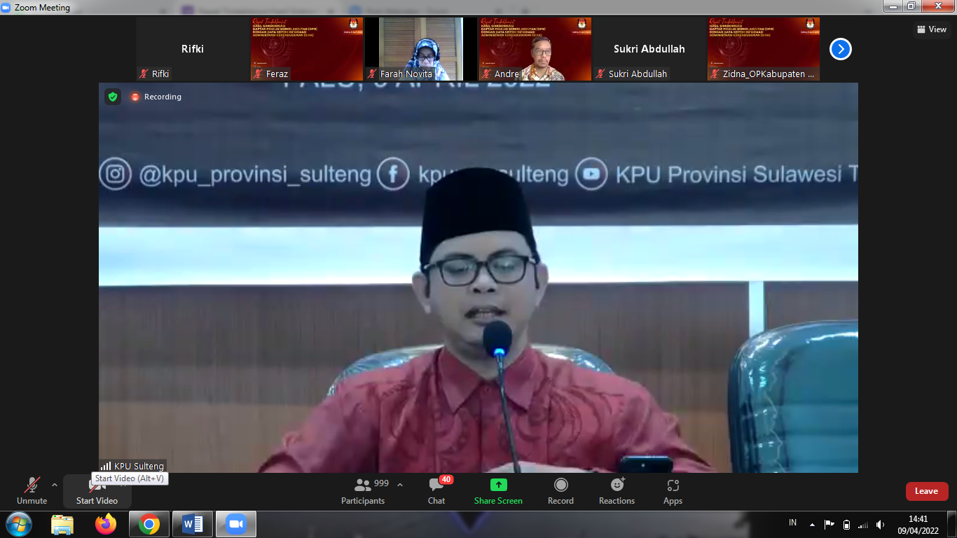 Sabtu (09/04/2022), KPU Kabupaten Wonosobo Divisi Perencanaan Data dan Informasi mengikuti Rapat Koordinasi dengan KPU RI dengan tema Tindak Lanjut Hasil Sinkronisasi DPB - SIAK . Acara dimulai pukul 14.00 WIB. Kegiatan yang dilaksanakan secara daring ini diikuti oleh Divisi Perencanaan Data dan Informasi KPU Provinsi dan KPU Kabupaten seluruh Indonesia. Acara dibuka oleh Bapak Viryan Komisioner KPU RI Divisi Perencanaan Data dan Informasi. Dalam sambutannya Ia menyatakan bahwa persoalan Daftar Pemilih selalu berkelanjutan dari tahun ke tahun disebabkan karena tidak ada nya Pemutakhiran Data Pemilih secara berkelanjutan. Untuk mengatasi hal tersebut KPU RI melaksanakan program Pemutakhiran Daftar Pemilih dilakukan secara Berkelanjutan sejak beberapa tahun terakhir. Untuk menunjang program tersebut KPU RI membuat Sistem Apilkasi yaitu Lindungi Hakmu.Dengan Aplikasi ini masyarakat dapat dengan mudah mengecek apakah dirinya sudah masuk dalam daftar pemilih ataukah belum.Program ini diharapkan dapat mewujudkan tersusunnya daftar pemilih yang akurat dan valid. Kegiatan ini juga diharapkan mampu merubah stigma masyarakat jika Pemilu itu komlpek dan susah menjadi sederhana dan mudah.