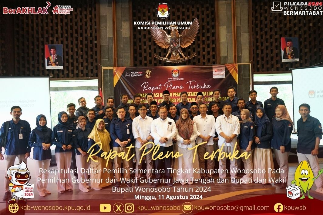 KPU Kabupaten Wonosobo melaksanakan rapat pleno terbuka rekapitulasi Daftar Pemilih Sementara (DPS) tingkat Kabupaten Wonosobo pada Pemilihan Gubernur dan Wakil Gubernur Jawa Tengah, Bupati dan Wakil Bupati Wonosobo Tahun 2024. Rapat pleno dilaksanakan pada hari Minggu, 11 Agustus 2024 di Hotel Dafam, Wonosobo. Kegiatan rapat pleno diikuti oleh Forkompimda, Dinas / Instansi terkait, Perwakilan Partai Politik yang mendapatkan suara pada Pemilu 2024, Pemantau Pemilihan, Bawaslu Wonosobo, Ketua dan Anggota PPK divisi data dan Informasi Se Kabupaten Wonosobo, beserta jajaran Komisioner dan Sekretariat KPU Kabupaten Wonosobo.
