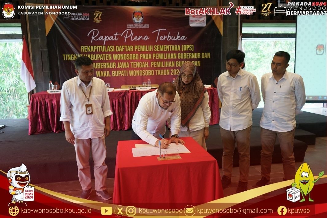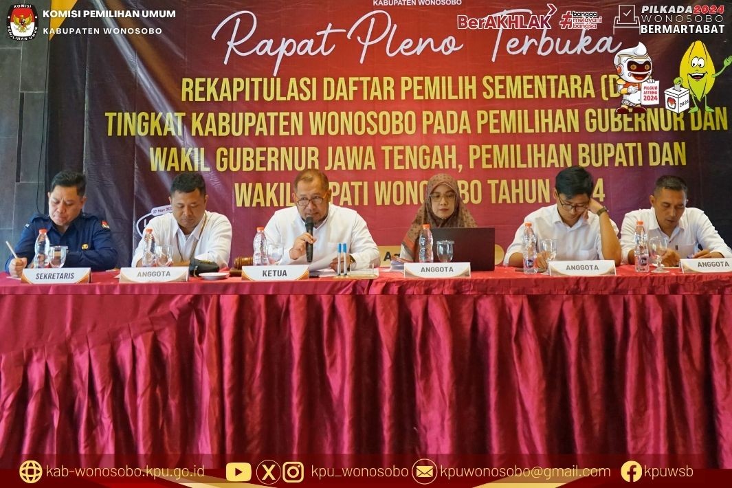 Pelaksanaan rapat pleno dipimpin oleh Ketua KPU Kabupaten Wonosobo, Bapak Ruliawan Nugroho. Selanjutnya adalah pembacaan tata tertib rapat pleno oleh anggota KPU Divisi Hukum dan Pengawasan, Bapak Kabul. Laporan penyusunan daftar pemilih sementara di Kabupaten Wonosobo dibacakan oleh anggota KPU Kabupaten Wonosobo Divisi Teknis Penyelenggara Pemilu, Bapak Robingul Ahsan. Pembacaan rekapitulasi daftar pemilih sementara dilakukan oleh anggota KPU divisi perencanaan, data dan informasi, Ibu Yusy Arafah. Daftar Pemilih Sementara tingkat Kabupaten Wonosobo pada Pemilihan Gubernur dan Wakil Gubernur Jawa Tengah, Bupati dan Wakil Bupati Wonosobo Tahun 2024 berjumlah 699.759 pemilih. Terdiri dari 335.464 pemilih laki – laki dan 344.295 pemilih perempuan yang tersebar di 1.556 tempat pemungutan suara (TPS), 265 Desa / Kelurahan, dan 15 Kecamatan. Terdapat 11.849 pemilih baru, 11.962 pemilih tidak memenuhi syarat, dan 15.316 pemilih yang mengalami perbaikan data pemilih.