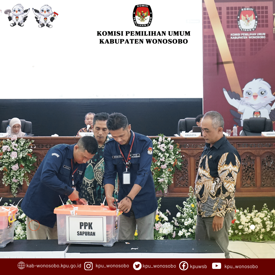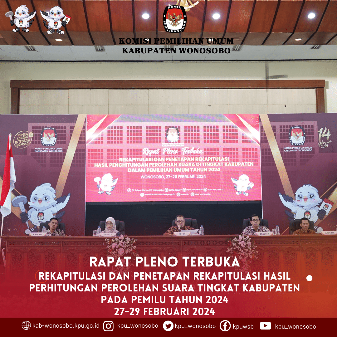 Selasa, 27 Februari 2024 Komisi Pemilihan Umum Kabupaten Wonosobo melaksanakan pembukaan Rapat Pleno Terbuka Rekapitulasi Dan Penetapan Rekapitulasi Hasil Perhitungan Perolehan Suara Tingkat Kabupaten Pada Pemilu Tahun 2024. Pembukaan Rapat Pleno Terbuka ini dihadiri Bupati Wonosobo, FORKOPIMDA, BAWASLU Kabupaten Wonosobo, PPK Se-Kabupaten Wonosobo, Ketua Parpol, Saksi Presiden dan Wakil Presiden, Saksi Partai Politik dan Saksi DPD.