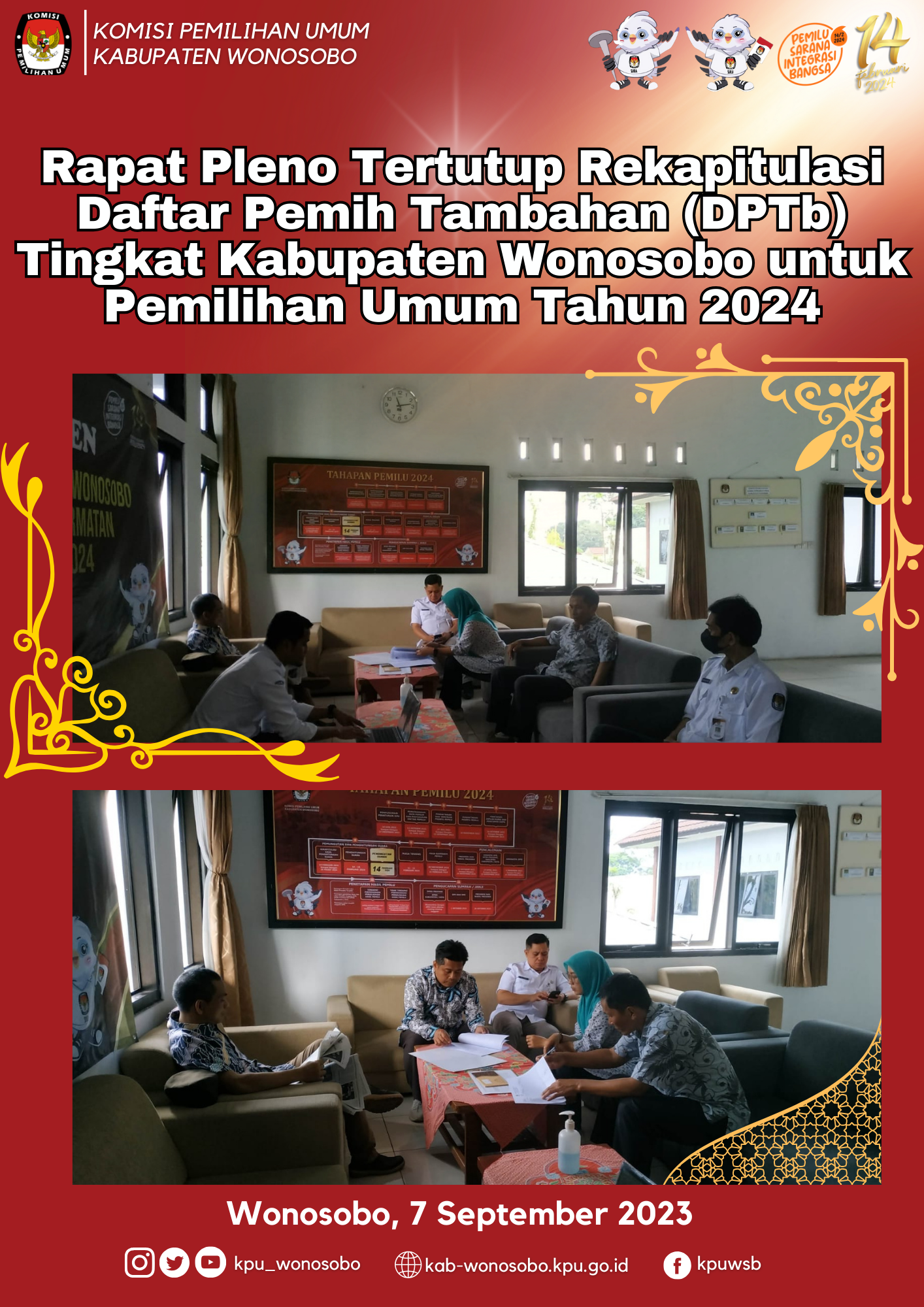 KPU Kabupaten Wonosobo melaksanakan Rapat Pleno Tertutup Rekapitulasi Daftar Pemilih Tambahan (DPTb) Tingkat Kabupaten Wonosobo untuk Pemilihan Umum Tahun 2024 pada hari Kamis, 7 September 2023. Rapat pleno diikuti oleh Komisioner KPU Kabupaten Wonosobo, Sekretaris KPU Kabupaten Wonosobo dan Kasubbag serta Pelaksana di bagian Perencanaan, Data dan Informasi Sekretariat KPU Kabupaten Wonosobo. Rekapitulasi daftar pemilih tambahan dilakukan setiap bulan hingga H - 7 sebelum hari pemungutan suara.