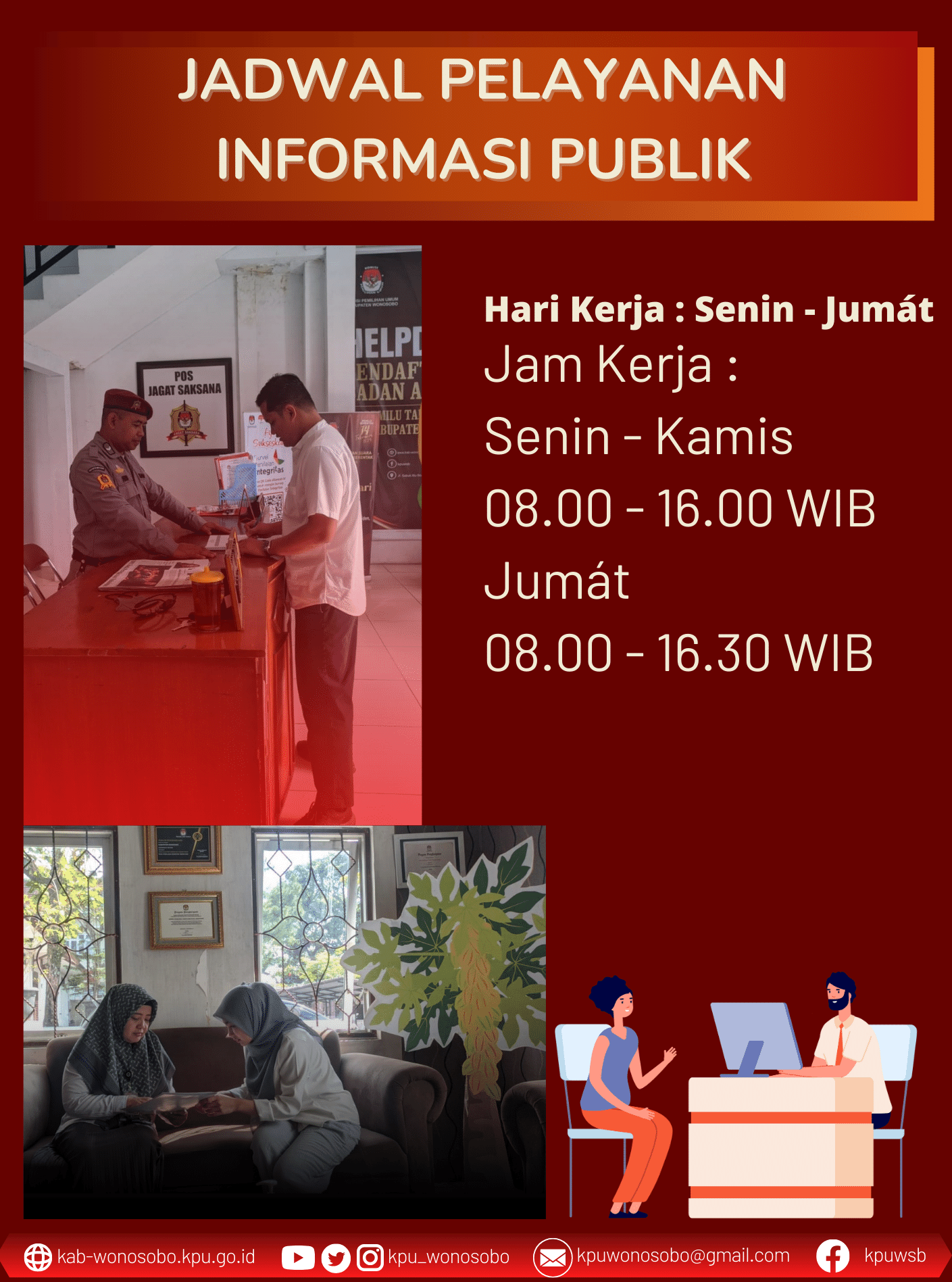 Jadwal Pelayanan Infromasi dan Data dapat langsung datang ke KPU Kabupaten Wonosobo di Jl. Sabuk Alu No.2b, Wonosobo Timur, Wonosobo Tim., Kec. Wonosobo, Kabupaten Wonosobo, Jawa Tengah 56311 pada jam kerja sesuai jadwal diatas.